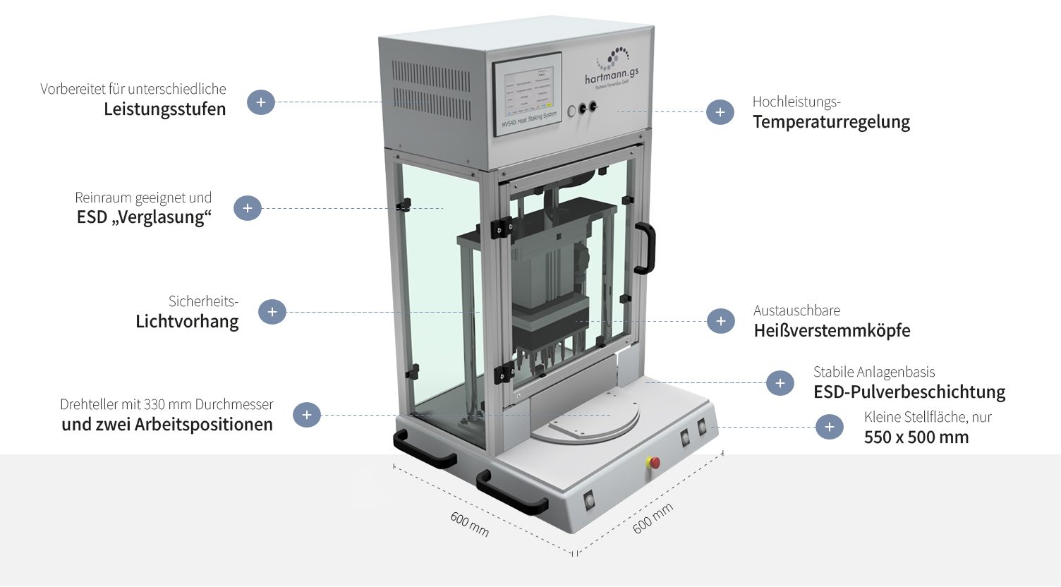 Nahezu unbegrenzte Anzahl von Thermoden zum gleichzeitigen Umformen mehrerer Kunststoffpins- oder laschen. Thermoden mit Hartmann-LongLifeFinish für maximalen Verschleißschutz.