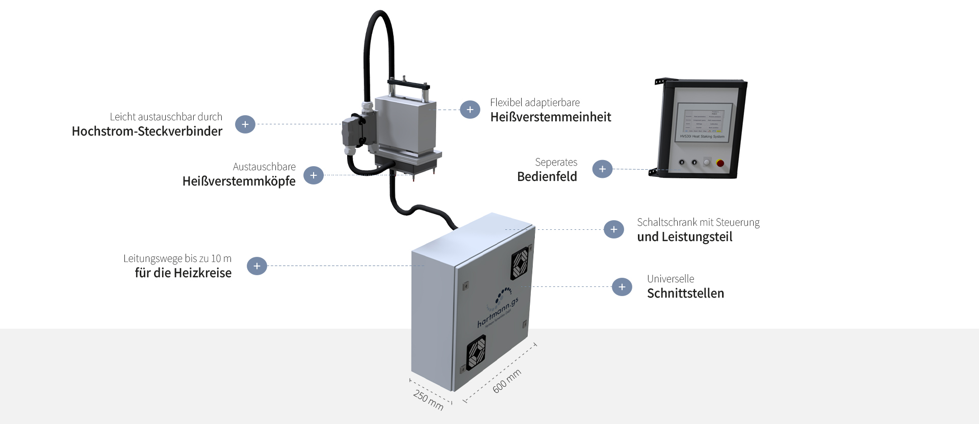 Nahezu unbegrenzte Anzahl von Thermoden zum gleichzeitigen Umformen mehrerer Kunststoffpins- oder laschen. Thermoden mit Hartmann-LongLifeFinish für maximalen Verschleißschutz.